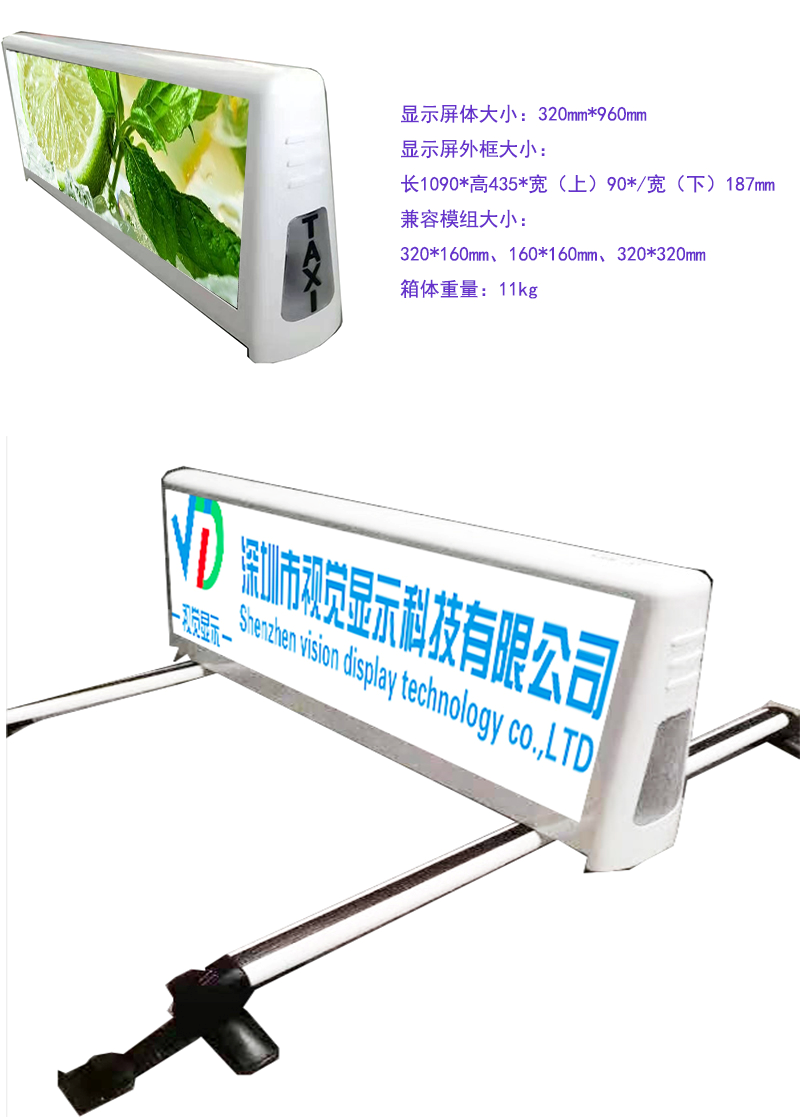 LED出租车显示屏/的士屏LED出租车显示屏、的士屏是一款置于车顶,占用空间非常小,受众范围却非常广的流动显示屏,显示的图片、文字、视频等内容通过集团网络控制,可同时操控单独一部车、多部车或所有车的显示屏幕,即使屏幕不在同一个城市,它也可以通过GPRS发送指令和信息。作为流动显示屏,LED车顶屏是商家、社会团体、企业等团队团体发布公益广告、形象广告、活动信息的首选。LED出租车显示屏/的士屏规格与