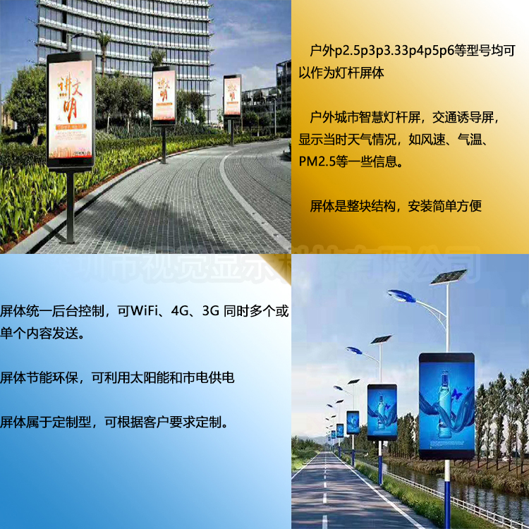视觉显示拥有P2.5/P3/P3.33/P4/P5/P6等灯杆屏型号,屏体统一后台控制,可通过WIFI/4G/3G发送同时多个或单个内容。屏体是定制式,可根据客户需求定制。屏体为整块式,安装维护简单便捷。