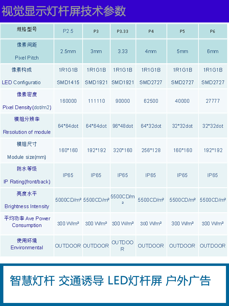 5、高清P2.5智能灯杆屏防护等级IP65以上,不怕任何恶劣天气。