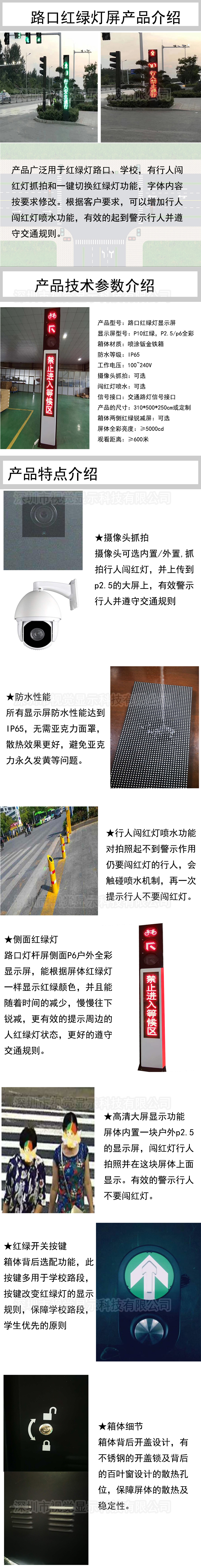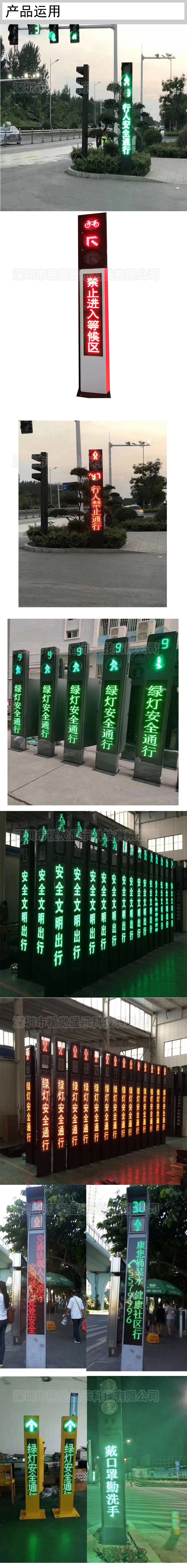 安装竖立在十字路口或人行横道的红绿灯交通显示屏整齐有序的显示了红绿灯标识、方向指示、等待倒计时、文字显示、违反交通规则抓拍等功能,保障、警示路人有序和遵守交规的通过路口。